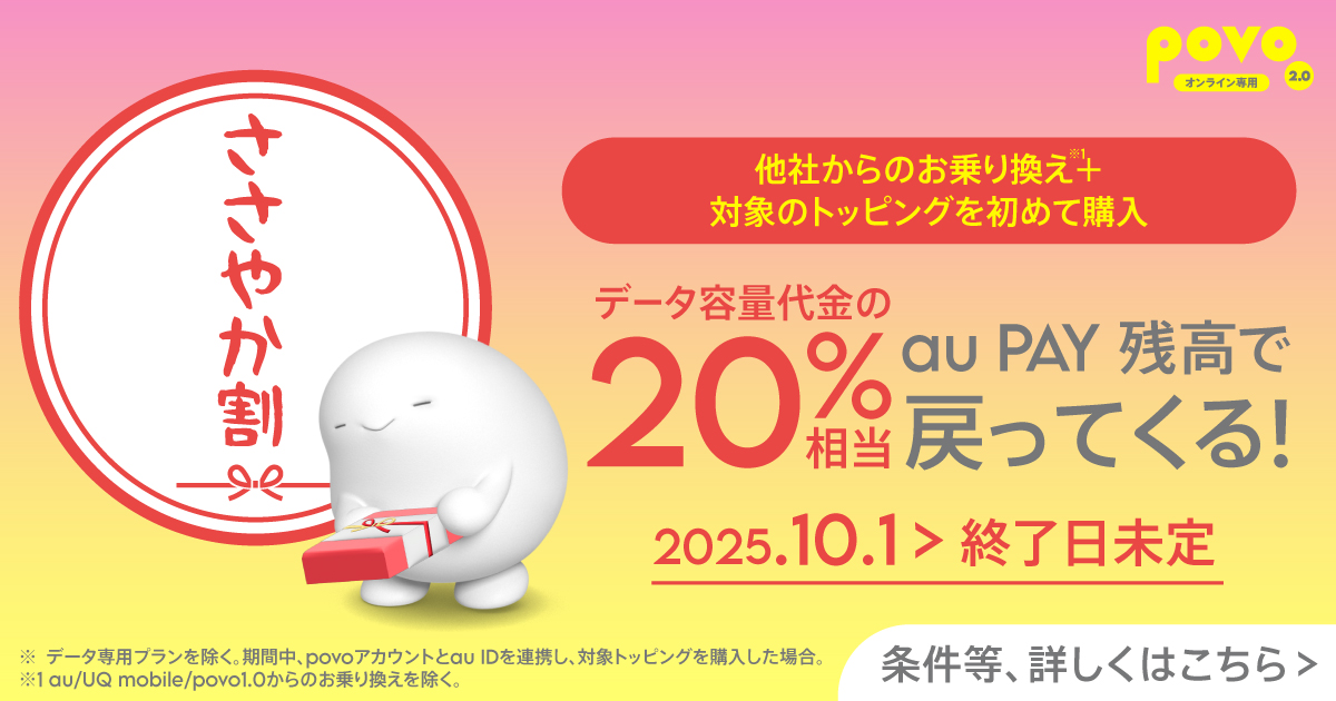 ご利用にはSIMフリーまたはSIMロックを解除したpovo2.0の対応端末が必要です。
